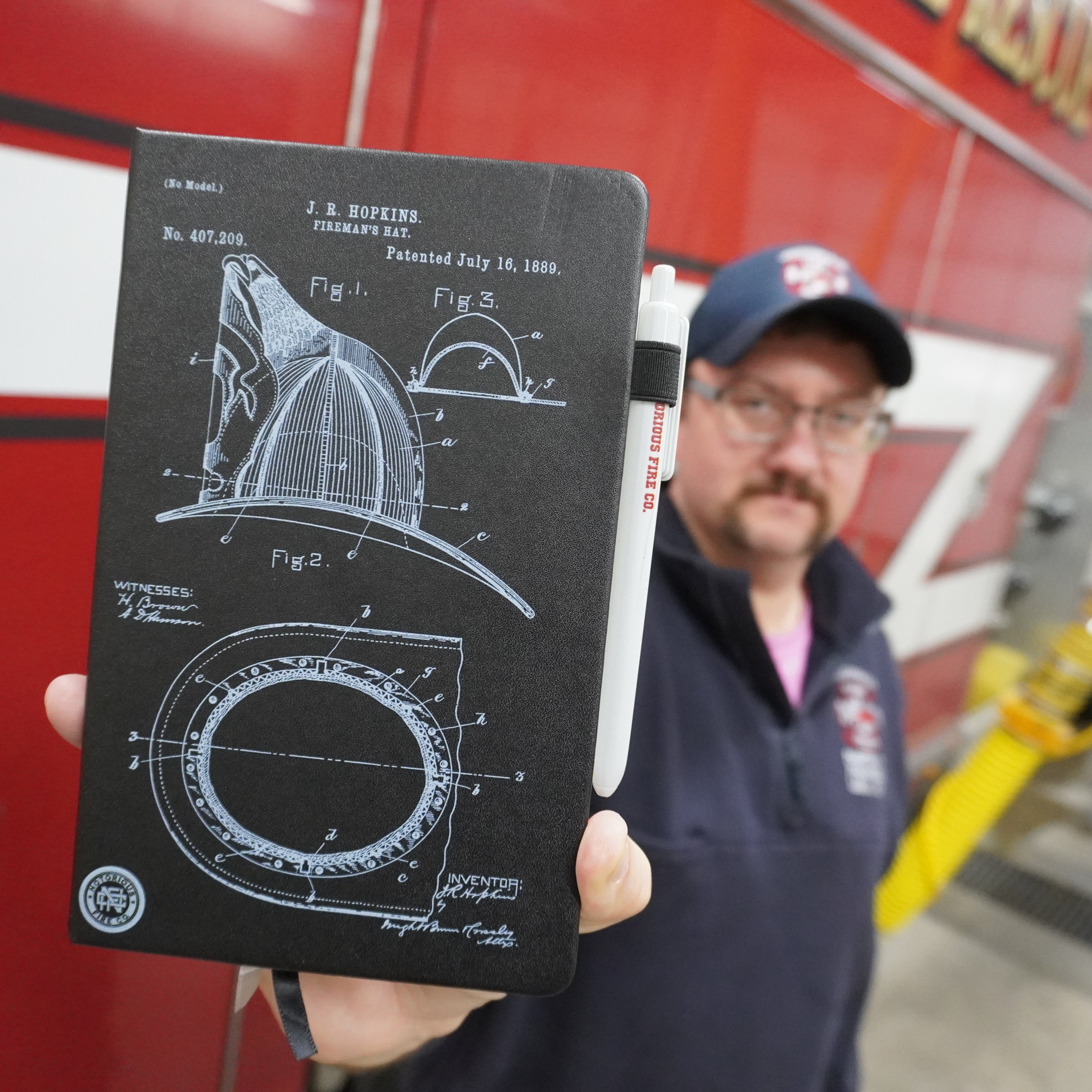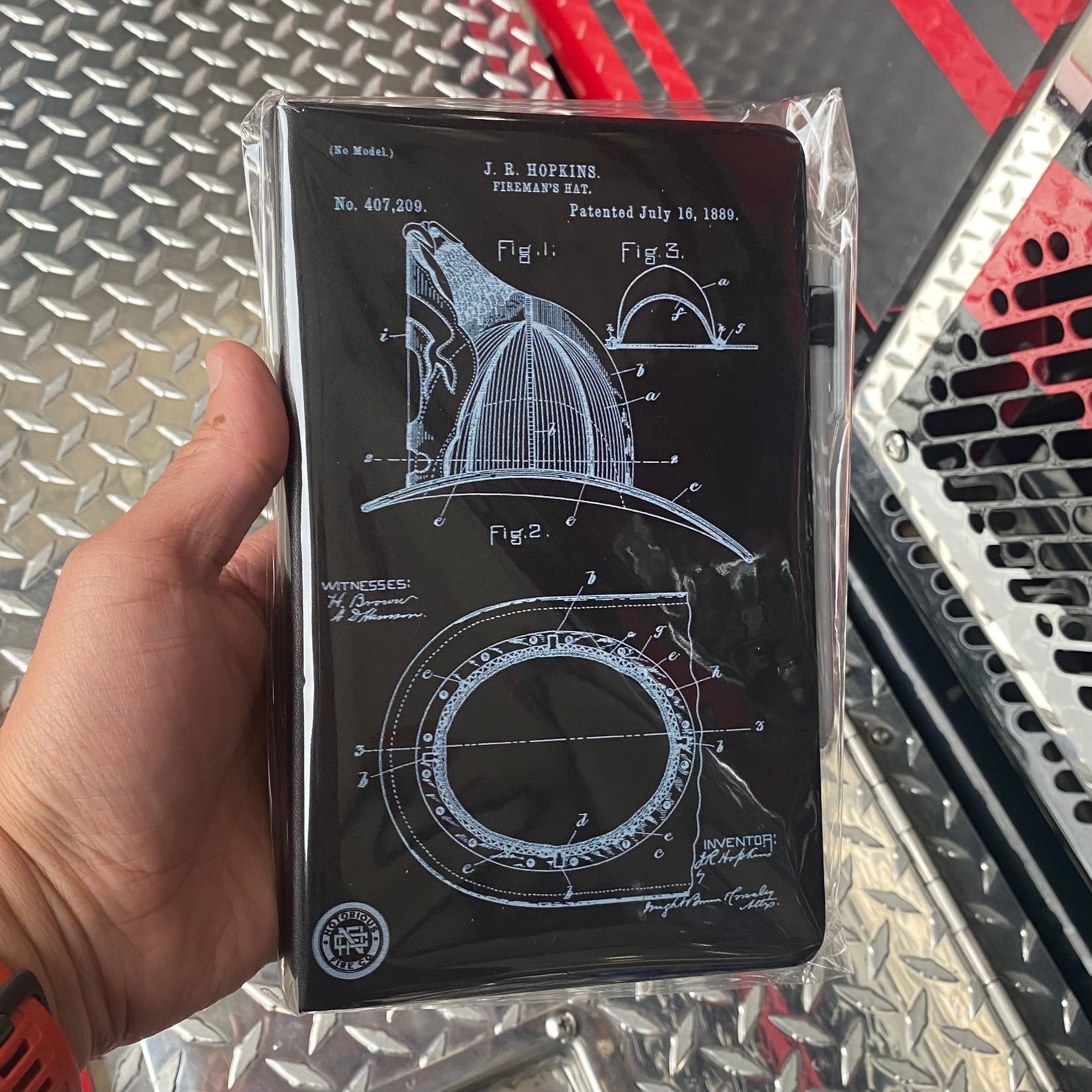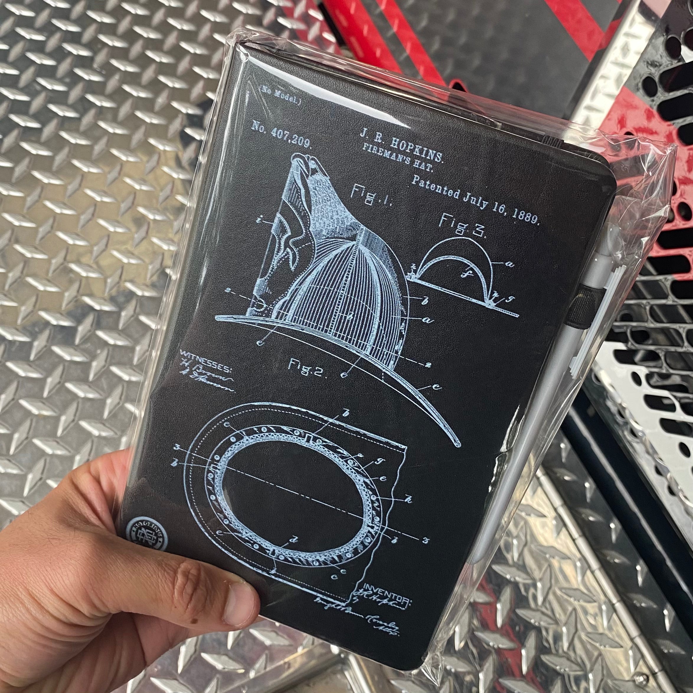 A classic, vintage, blueprint style design of a firefighter helmet decorating this hardcover journal. The journal contains 64 pages of college ruled paper, a pre-made bookmark, a black ink pen and an elastic band to keep the journal secure.